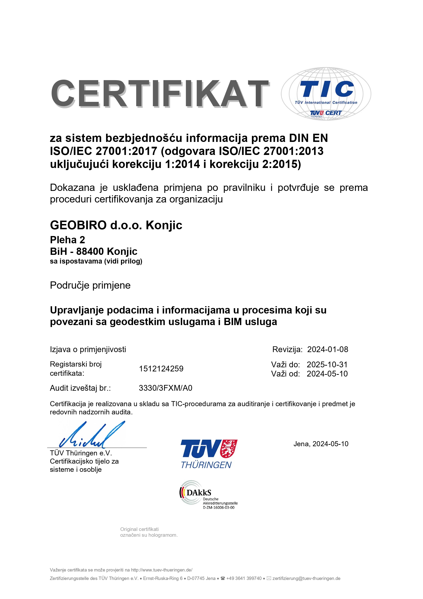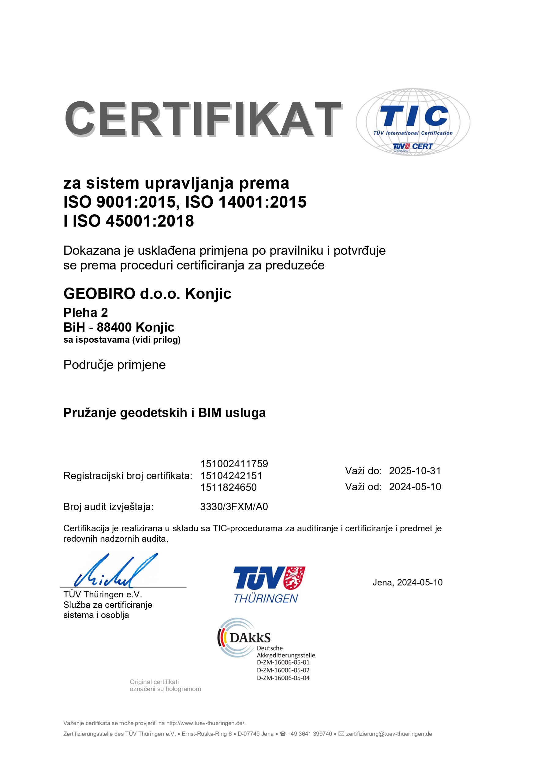 Za svu navedenu opremu posjedujemo važeće certifikate izdane od nadležnih institucija koji garantuju ispravnost geodetske opreme.